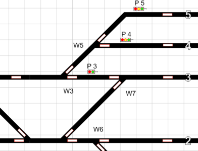 Beschriftungen für Gleisbezeichnungen, Weichennummern oder Signalsymbole eingraviert.