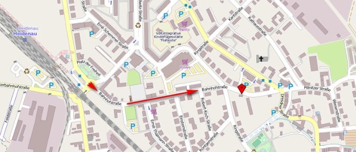 auf der Bahnhofstrasse fahren Sie bis zum Parkplatz des Getränkemarktes “Kick in”, hier stehen Kurzzeitplätze
